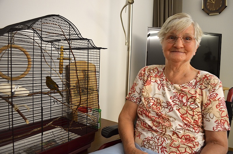 Haustiere wirken sich positiv und belebend auf Menschen aus. Das schreibt das Feldheim in seiner Hausbroschüre. „Sie helfen gegen die Vereinsamung der Bewohner“, sagt Co-Pflegedienstleiterin Dora Wyss. Trotzdem halten sich nur zwei der total 150 Bewohner ein Haustier. Eine Bewohnerin haust mit Chregu, einer Katze in ihrem Zimmer. Eine zweite – nämlich die gebürtige Eberseckerin Louise Erni (auf dem Bild) – teilt mit einem braunen Kanarienvogel ihre Wohnung. „Hansi ist mein ein und alles“, sagt die Pflegeheimbewohnerin. Am Abend, bevor sie zu Bett geht, deckt sie das Vogelkäfig zu. So könne Hansi besser schlafen. In den frühen Morgenstunden wird wieder abgedeckt. „Dann beginnt Hansi sofort zu singen“, sagt die 81-jährige und strahlt.